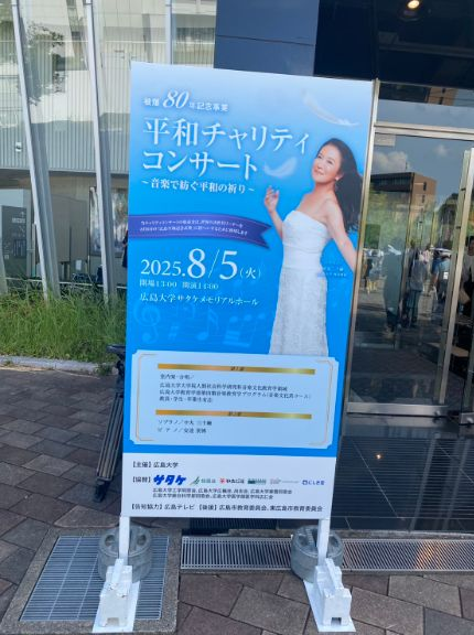 2025年8月5日(火) 東広島キャンパスサタケメモリアルホールにて開催された、被爆80年記念事業 「平和チャリティコンサート」の様子をお送りいたします。 中丸の愛と祈りに満ちた歌声が会場内に響き渡り、お客様へ感動を与えました。 テーマの「祈り」「希望」「無償の愛」を音楽を通して、 ご来場された皆様が平和の大切さを分かち合い心温まるひとときとなっておりました。